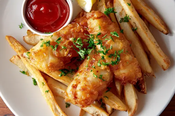 Plate the crispy fish alongside the golden fries. Add a wedge of lemon, a sprinkle of fresh parsley if you’d like, and serve with tartar sauce or ketchup.